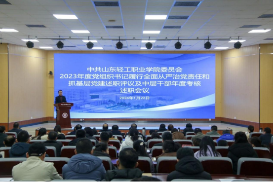 本站讯(通讯员 刘美玲)2024年1月22日,学校举行2023年度党组织书记履行全面从严治党责任和抓基层党建述职评议会议及中层干部年度考核述职会议。学校领导班子成员,各党组织书记、科级及以上干部和教师代表参加会议。会议由党委委员、党委组织统战部部长常立主持。