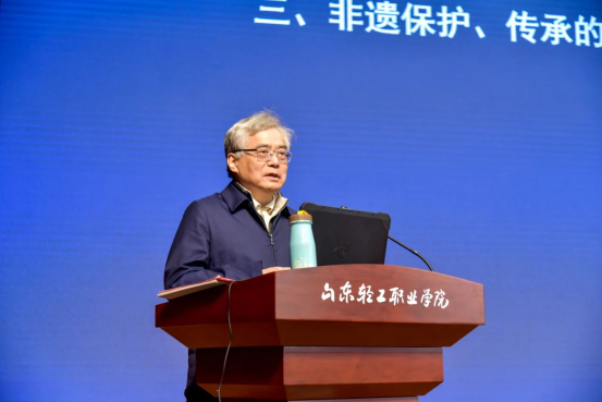 文化和旅游部原党组成员、副部长项兆伦以《中国非物质文化遗产保护的认识与实践》为题作“齐鲁非遗大讲堂”第一讲。项兆伦从非物质文化遗产的基本概念导入,详细讲解了非物质文化遗产的类别与特点。他指出,非物质文化遗产是优秀文化传统在今天生活中的现实体现,既反映了世代相传的习俗、价值观、审美和知识,又在时代变迁和自身的传承实践中不断丰富与发展。他表示,做好非遗保护工作,要坚持以习近平新时代中国特色社会主义思想为指导,贯彻落实习近平总书记关于弘扬传承中华优秀传统文化、实现创造性转化和创新性发展的重要要求,坚持“见人见物见生活”的理念,树立整体观、实践观、人本观,用整体的眼光看非遗,在积极的实践中保护和传承非遗,尊重传承人的地位和创造性表达权利。讲座内容丰富、阐述深刻,帮助大家打开思路、拓宽视野,为学校做好非遗保护工作提供了宝贵指导。
