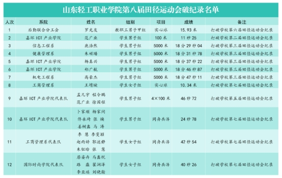 经过两天的激烈角逐,共有12人次打破学校田径运动会7个项目的纪录。
