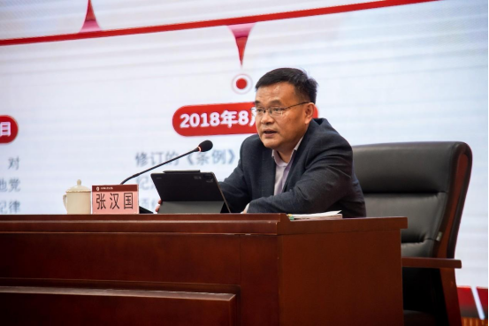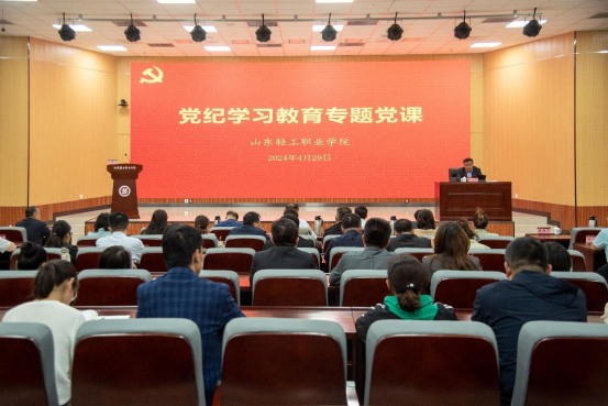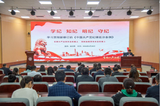 本站讯(通讯员 陈梦瑶)为认真贯彻落实党中央部署要求和省市委工作安排,高质量开展好党纪学习教育,4月29日,学校举办党纪学习教育读书班。读书班上,党委委员、纪委书记、监察专员张汉国讲专题党课,学校领导班子成员、科级及以上干部、各党组织党员参加学习,党委委员、党委组织统战部部长常立主持党课报告会。