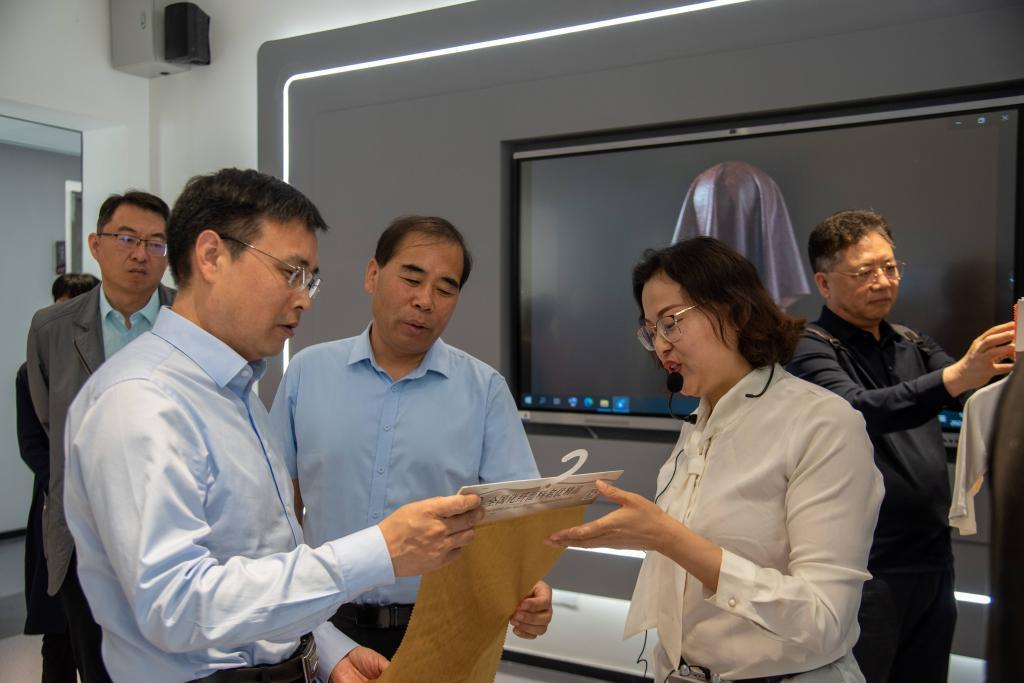 袁雷陪同马培安一行先后参观了学校丝绸纺织服装全链路数字化展厅、智慧校园服务中心,介绍了学校“校链企”融合发展模式、“阳光小青”一站式服务平台、智慧校园建设等方面的经验做法。