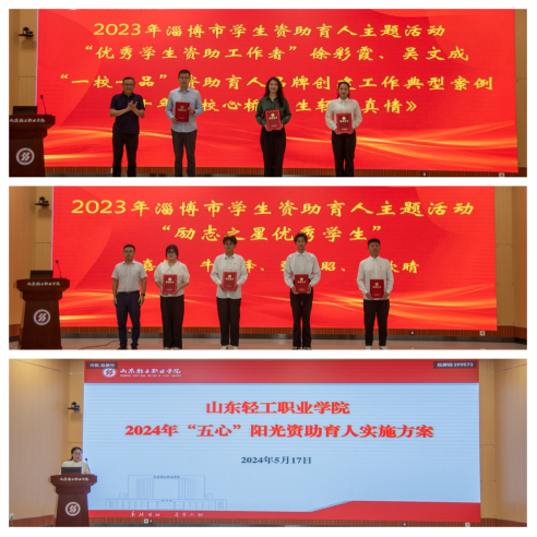 淄博市教育服务中心主任徐学勇同志、党委学生工作部部长杨永亮同志分别为2023年淄博市学生资助育人主题活动获奖者颁奖。学生工作部副部长李敏宣读了学校《2024年“五心”阳光资助育人活动方案》。