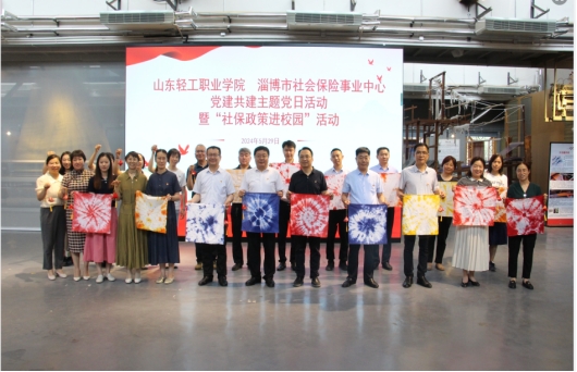 签约仪式后,淄博市社会保险事业中心第三党支部与学校组织人事党支部、财务党支部、国际时尚党支部成员共同开展主题党日活动。相关成员参观了学校1960文化创意园,体验“我们的节日”端午节包香包、“传统文化”扎染等轻院特色活动,并在学校文化创意园进行社保政策宣讲。