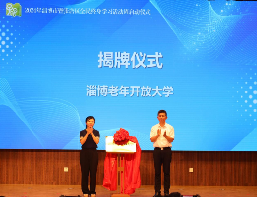 山东省教育厅民办教育与继续教育处二级调研员刘天华,山东开放大学社区教育服务中心主任、老年教育学院院长邹丽伟共同为淄博老年开放大学揭牌。
