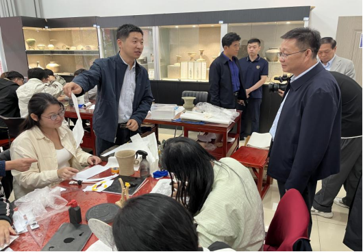 座谈会后,唐勋一行先后到文物与艺术系、初心馆、大学生事务服务中心等地进行了实地调研。在文物与艺术系,现场观摩了考古测量、古籍修复、书画装裱与修复等技艺流程,对文物考古技术专业与文物修复与保护专业的特色亮点、培养目标及就业方向进行了详细了解。在初心馆,考察团重温了一代又一代中国共产党人矢志不渝、砥砺前行的峥嵘岁月,在一幅幅老照片、一件件道德模范事迹前驻足凝思,追忆波澜壮阔的革命历程,汲取时代榜样的力量。在大学生事务服务中心参观了线下服务大厅,学习了以“一站式”校内服务平台为抓手,线上线下相结合,精准对接学生需求的特色渠道。