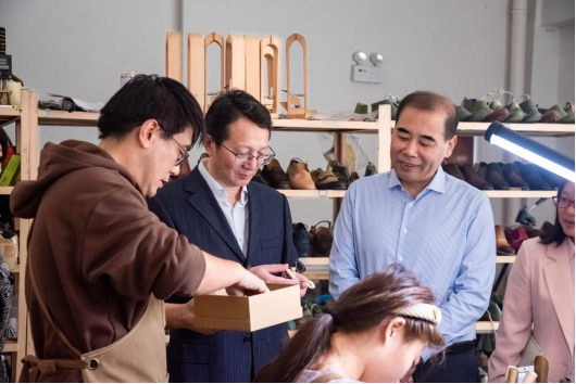 在1960大学生创新创业中心,洪霄一行参观了青悠坊、丝之韵、素履坊、轻悦·淄博好品等店铺,了解了国潮文创产品、服装高级定制中的各项手工技艺,以及学校在数字化转型、电商运营等方面的工作开展情况。在丝绸艺术中心,洪霄观看了数字印花全过程,对服装CAD设计、数字印花等特色课程进行了详细了解。在智慧校园服务中心,洪霄调研了“阳光小青”一站式服务平台、智慧校园数字化平台建设等方面的经验做法。