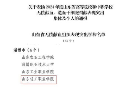 本站讯(通讯员 袁奇 逄红)近日,山东省卫生健康委员会、省教育厅、人力资源和社会保障厅、共青团山东省委、省红十字会联合发布《关于表扬2024年度山东省高等院校和中职学校无偿献血、造血干细胞捐献表现突出集体及个人的通报》(鲁卫医急字〔2025〕5号)。我校荣获“山东省无偿献血组织表现突出学校”,2名教师获评“山东省无偿献血工作表现突出个人”,2名学生获评“山东省无偿献血志愿服务表现突出大学生”,2名学生获评“山东省无偿献血爱心大学生”,这是我校继去年再次获得省级表扬。