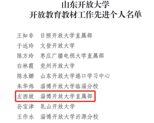 本站讯(通讯员 左西坡)近日,山东开放大学2024年度开放教育教材工作研讨活动在石家庄顺利举行。会议对2024年度在开放教育教材资源配置与应用工作中表现突出的集体和个人予以通报表彰,其中,淄博开放大学荣获“开放教育教材工作先进集体”称号,左西坡获评“开放教育教材工作先进个人”。