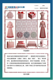 武燕、丛文新、周立群、杨文团队打造的《鲁锦吉庆系列面料》作品获得实物产品组金奖。该作品以鲁锦经典“云雷纹”为核心,融合“双喜”、“爱心”等吉祥符号,通过精妙的织物结构设计,实现了双面清晰、浮长短、一次穿综即可织造多款纹样的高性能织物。设计全程深度融合了多臂CAD软件与AI图像生成工具,探索了传统工艺与数字技术结合的创新路径。李群英、张靖玮团队的《雾蓝织序》获得概念组金奖。该作品提炼传统云雷纹与灯笼纹元素,结合“AI辅助+手工精修”创作模式,设计师们凭借对都市通勤场景的敏锐洞察与深刻理解,迅速催生出适配其氛围的绝妙配色与精致版型方案,实现非遗文化与现代时尚的双向赋能。陈永花携手校企合作企业淄博海润丝绸发展有限公司,共同设计的《丝绢植物染鲁锦衬衣》荣获实物产品组金奖。该作品融合鲁锦文化内涵与现代AI技术,以“多边形+大斗纹”创新转译传统纹样,兼顾文化辨识度与日常实用性;选用丝绢面料,实现亲肤舒适与挺括造型的平衡。项目体现了数字化手段对传统工艺的高效赋能,是校企协同创新的重要成果。