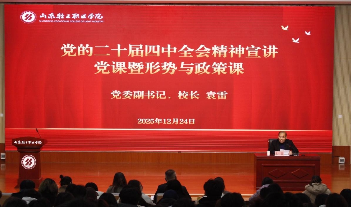 本站讯(通讯员 房屹 王晓钰)为深入学习贯彻党的二十届四中全会精神,切实将师生思想和行动统一到党中央决策部署上来,12月24日,山东轻工职业学院党委副书记、校长袁雷在文昌湖校区开展党的二十届四中全会精神宣讲党课暨形势与政策课。信息工程系、嘉环ICT产业学院全体教职工及150名学生代表参加宣讲会,信息工程系党总支书记房屹主持会议。