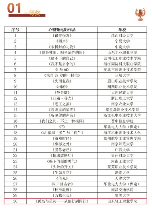 本站讯(通讯员 阎欣)近日,由全球文化教育交流委员会、国际心理委员与朋辈支持联盟联合主办的第五届全国高校心理微电影(心理短视频)优秀作品展示活动获奖结果正式公布。全国各高校的213部作品入选展示,学校两部参赛作品斩获佳绩:《孤岛与星河——从独行到同行》荣获一等奖,《隔阂之镜》荣获二等奖。
