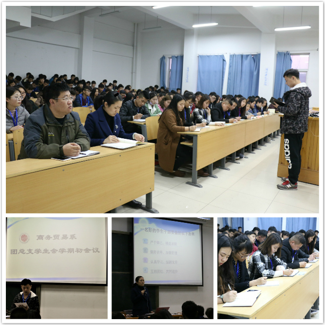 2017年2月27日下午6点,商务贸易系在J6406召开了团总支学生会期初工作会议。参加本次例会的有系学管副主任巩向玮,辅导员卢俊、曲晶晶,以及学生会全体成员。