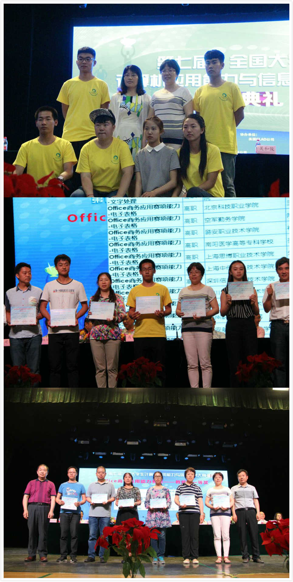 经过多轮激烈角逐:在“office商务应用能力赛项—文字处理子项目”中,张文潮获得一等奖,刘金凤、王鑫硕获得二等奖;在“office商务应用能力赛项—电子表格子项目”中,李泽坤获得二等奖,隋青霞获得三等奖;在“office商务应用能力赛项—简报设计子项目”中,吕爽获得三等奖;我校代表队获得团体三等奖,我校被授予优秀组织奖。