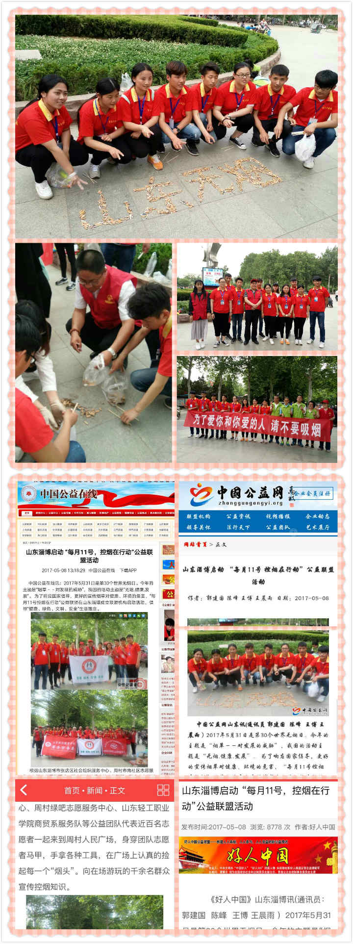 2017年5月31日是第30个世界无烟日。今年的主题是“烟草——对发展的威胁”,我国的活动主题是“无烟、健康、发展”。为了响应国家倡导,更好的宣传烟草对健康、环境的危害,结合我院禁烟活动的开展,5月7日商务贸易系青年志愿者同全国公益联盟联合发起人张云强秘书长来到了周村人民广场,与山东淄博市张店区社会组织服务中心、周村区市南社区爱心时间银行志愿服务队、淄博行影帮扶中心、新阳光残疾人互助家园、周村12349养老服务中心、周村绿吧志愿服务中心共同参加了“每月11号全国控烟在行动”公益活动启动活动。