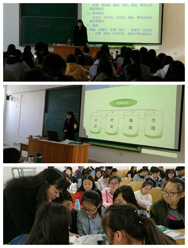 邢工程师以常用纺织面料为切入点,从纺织品的质量影响因素、常见纺织品疵点、桑蚕丝织物的检验标准及常用检验方法四方面展开讲述。讲座过程穿插图片、视频欣赏,问题思考,案例分析,实物分析及与学生互动等环节。讲座内容丰富,设计独具匠心,获得学生一致好评。