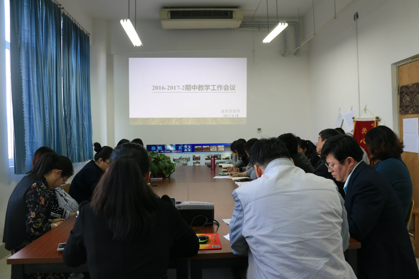 2017.4.18商务贸易系在J6312召开了“2016-2017-2学期期中教学工作总结”专题会议,全体教师参会。