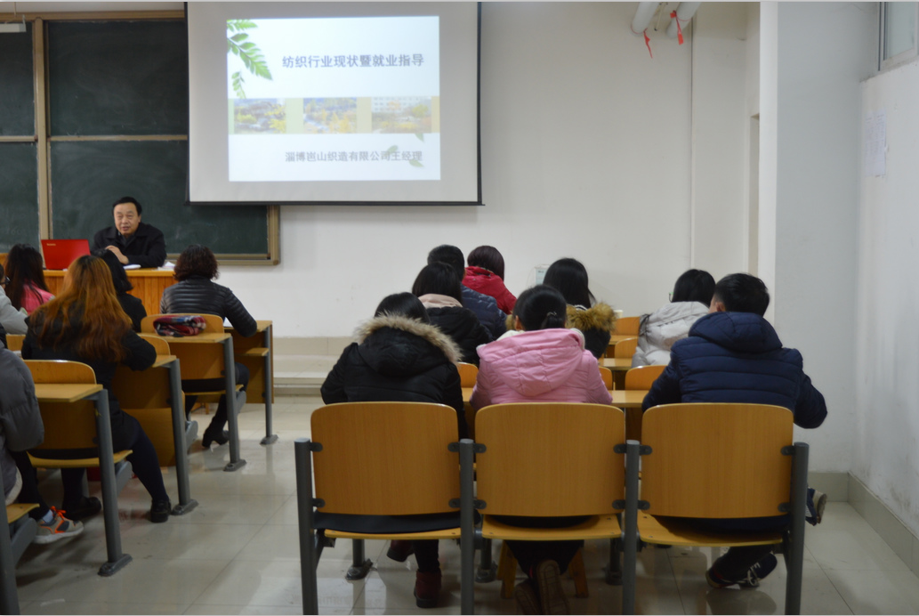 2016年12月23日下午2:30纺织服装工程系邀请淄博岜山织造有限公司王新生总经理为大家做淄博纺织行业发展史、纺织行业现状及就业指导专题讲座,会议由教学副主任丛文新老师主持,现代纺织技术专业全体教师和学生以及服装专业的部分师生参加了本次活动。