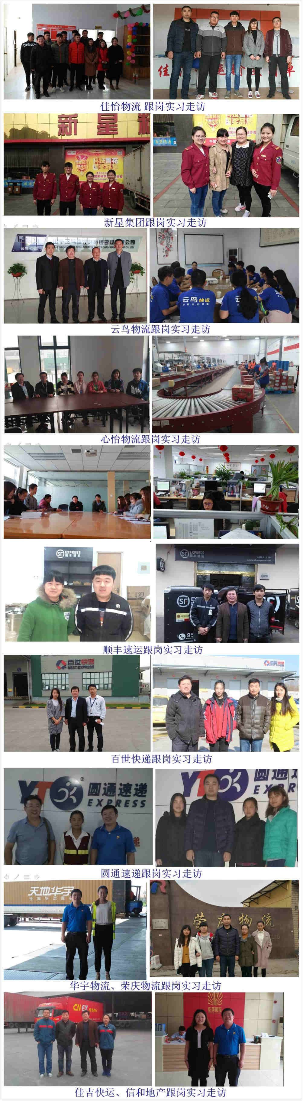 物流管理专业151名2014级跟岗实习学生主要集中在顺丰速运、心怡物流、百世快递、佳怡物流、华宇物流、圆通速递、新星集团、云鸟物流、荣庆物流、佳吉快运等主要合作单位实习。商务贸易系安排校内指导教师通过电话、网络等各种方式及时和学生、企业联系人交流,了解学生的实习情况,和校外实习指导教师一道全程参与实习指导工作。