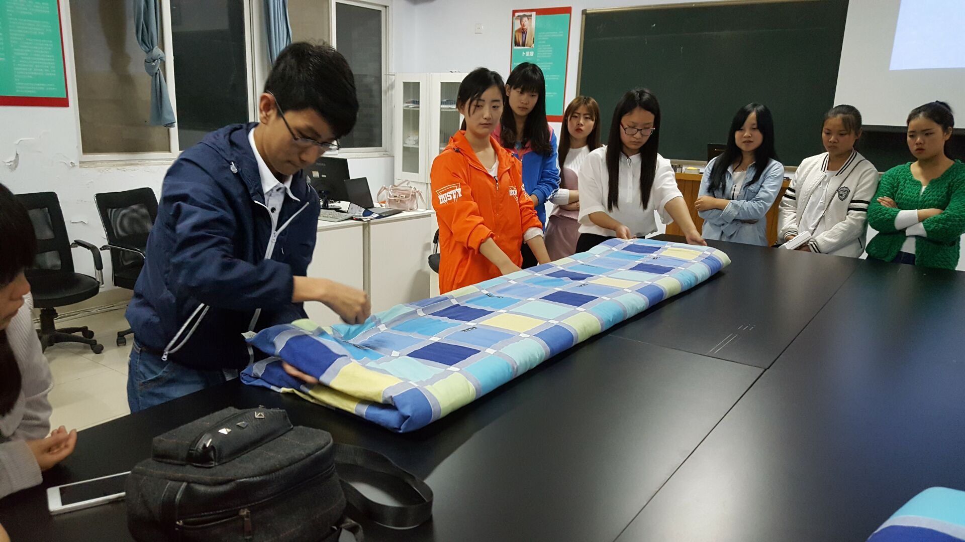 为更好的参与学院即将举办的宿舍内务大赛。5月12日,商务贸易系在J6208举办“叠被子比赛”热身交流会。系部辅导员卢俊、学生会干部及所有参赛同学都参加了本次交流。