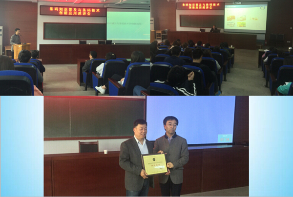 中国物流与采购联合会规划研究院院长助理杨天庆先生结合当前条码技术的应用现状,作了“条码技术新应用”报告。全国大学生条码自动识别知识竞赛组委会秘书长、21世纪中国电子商务网校校长张铎先生,结合国内外专家关于自动识别技术在未来超市、物联网,以及物料和包裹的智能仓储、分拣和配送等方面的应用前景,作了“大众创业、万众创新、条码应用、共享繁荣”的精彩报告。此外,还授予了我院 “全国大学生条码自动识别知识竞赛示范院校”荣誉称号。