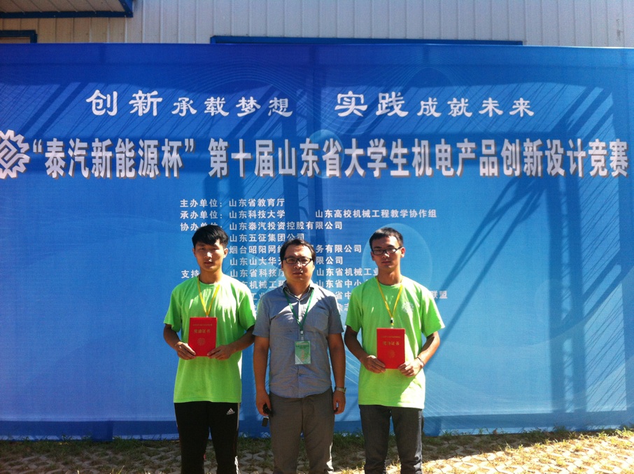 第十届山东省大学生机电产品创新设计竞赛是由山东省教育厅高教处主办,比赛采取团体赛形式,机电工程系成立参赛三个团队,在8月19日到22日在青岛科技大学进行的决赛中,李晋、范宏伟、沈玉胜、陈春志、张振筱的《全自动爬楼梯轮椅》获得了二等奖;郑敏、陈立民、曲峻杭、郭新杰、林玲玲的《无级变速轴传动自行车》获得了三等奖;郑敏、林玲玲、陈立民、曲峻杭、季念成的《无线智能充电器》获得了优秀奖的优异成绩。本次竞赛主题为“绿色 智能 融合 服务”,旨在加强大学生创新意识、合作精神、实践能力培养,促进大学生基础知识与综合能力、理论与实践的有机结合,提升创新实践能力。