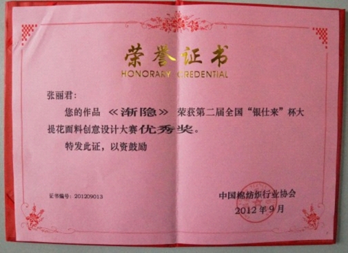 在9月9日在齐盛宾馆举行的第二届“银仕来”杯大提花面料创意设计大赛颁奖典礼上,由张苗苗老师指导的,我院纺织工程系学生白丽君同学荣获“最佳创意设计奖”,张丽君、裴昊群、曹雪娟三位同学获优秀奖。 本次大赛由中国棉纺织行业协会主办,山东省纺织工业协会、山东省淄博市经济和信息化委员会、山东省淄博市纺织行业协会承办,淄博银仕来纺织有限公司冠名协办。 本次大赛有全国20余家高等院校参赛,主要参加的学校有:南京艺术学院、鲁迅美术学院、天津美术学院、四川美术学院、东华大学、山东丝绸纺织职业学院、南通纺织职业学院等院校。主要参加的企业有:银士莱股份有限公司。本次大赛还有众多企业踊跃参与,相如银仕来股份有限公司、大染坊集团有限公司等。本次大赛共有600多幅作品参加,经过专家分小组进行层层评判,最终选出50多幅作品进入最后的奖项评选。我系选送的《青瓷》以独特的创作思路和新颖的表现手法获得最佳创意奖。 此次大赛主题确定为“新期待”,要求参赛选手围绕“新期待”的理念进行创意,适用适宜的技巧和方法,表现美好的情趣和格调,织就时尚的产品,让消费者享受衣着和家纺的改变而带来的愉悦,实现幸福生活的美好愿景。