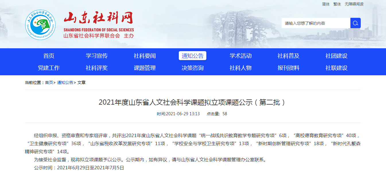山东省人文社会科学课题坚持以我省经济社会发展重大现实问题为主攻方向,课题类型包括:基础研究课题、应用研究课题和专项研究课题。本次获批的课题是“新时期创新管理研究专项”,全省共有18个项目获批。该研究专项围绕是山东省企业管理创新、社会治理创新、行政管理创新开展的专项研究,有利于加快推进社会治理能力现代化。