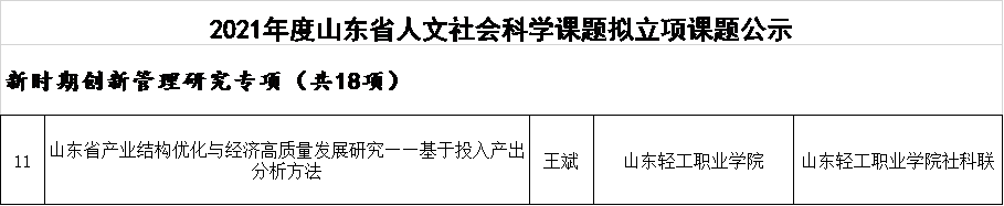 近日,山东省人文社会科学课题管理办公室下发关于《2021年度山东省人文社会科学课题拟立项课题公示(第二批)》的通知,我系王斌团队申报的《山东省产业结构优化与经济高质量发展研究--基于投入产出分析方法》获批立项。