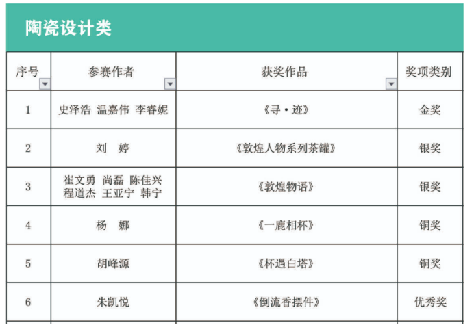 2021年4月25日,初赛经评委筛选,我院艺术设计系石峰老师指导的杨娜同学陶瓷设计类作品《一鹿相杯》、门明霞同学文创设计作品《飞天》突出重围,进入决赛。决赛现场采用实物的形式进行评比,并最终角逐出文创设计类金奖1名、银奖6名、铜奖10名、优秀奖49名;配饰设计类金奖1名、银奖1名、铜奖2名、优秀奖10名;陶瓷设计类金奖1名、银奖2名、铜奖2名、优秀奖10名;创意空间类金奖2名、银奖1名、铜奖3名、优秀奖10名;景观园林类金奖1名、铜奖2名;建筑设计类银奖1名、铜奖1名、优秀奖4名;数字影像类金奖1名、银奖3名、铜奖1名、优秀奖4名;