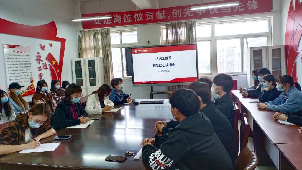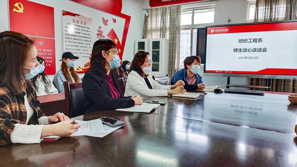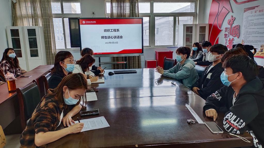 为不断改善学生在疫情防控常态化条件下的校园生活秩序和质量,了解学生的实际需求,纺织工程系于2022年5月10日在T6601开展了“师生谈心谈话会”,系党总支书记李群英、系主任陈爱香、学管主任董如雪、辅导员罗晓霞及各班学生代表参加了本会会议。