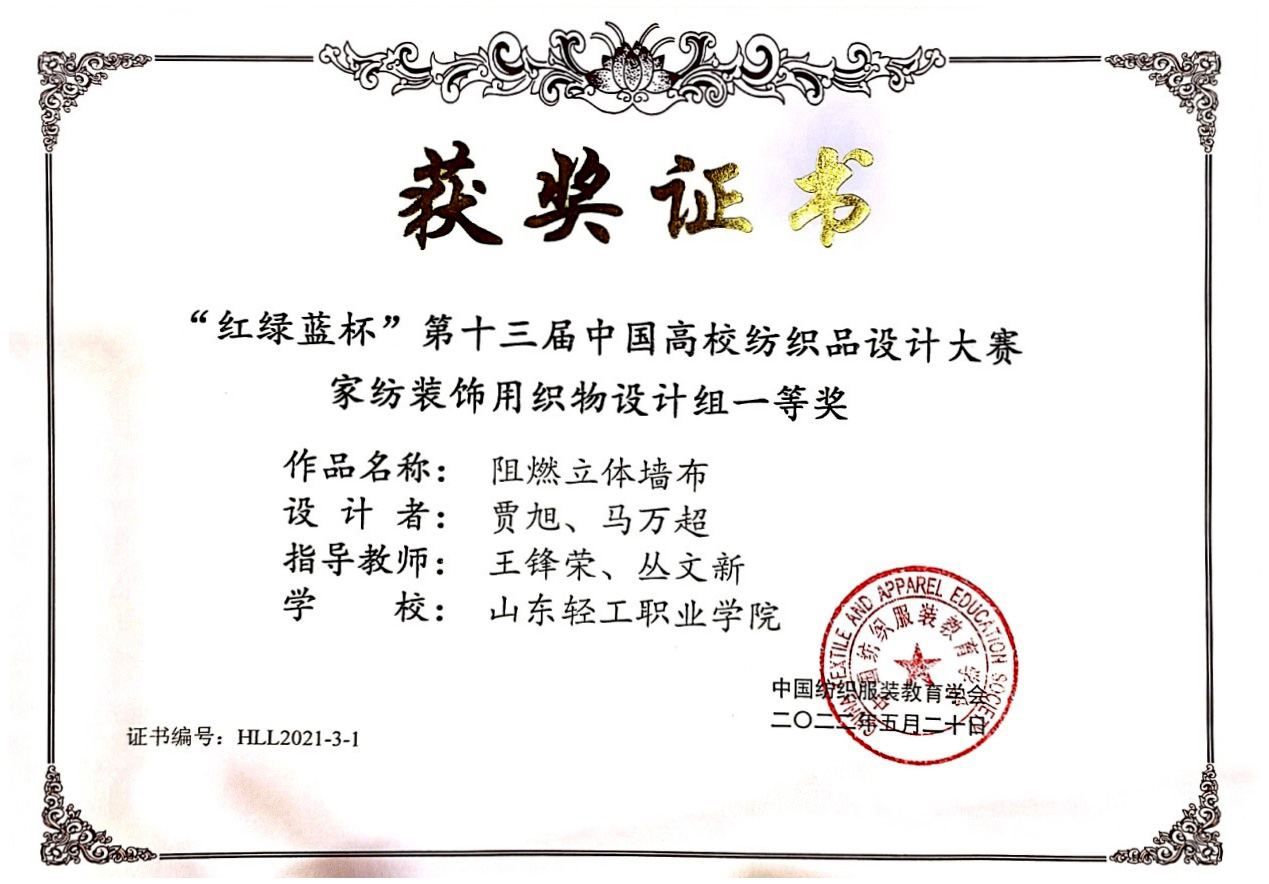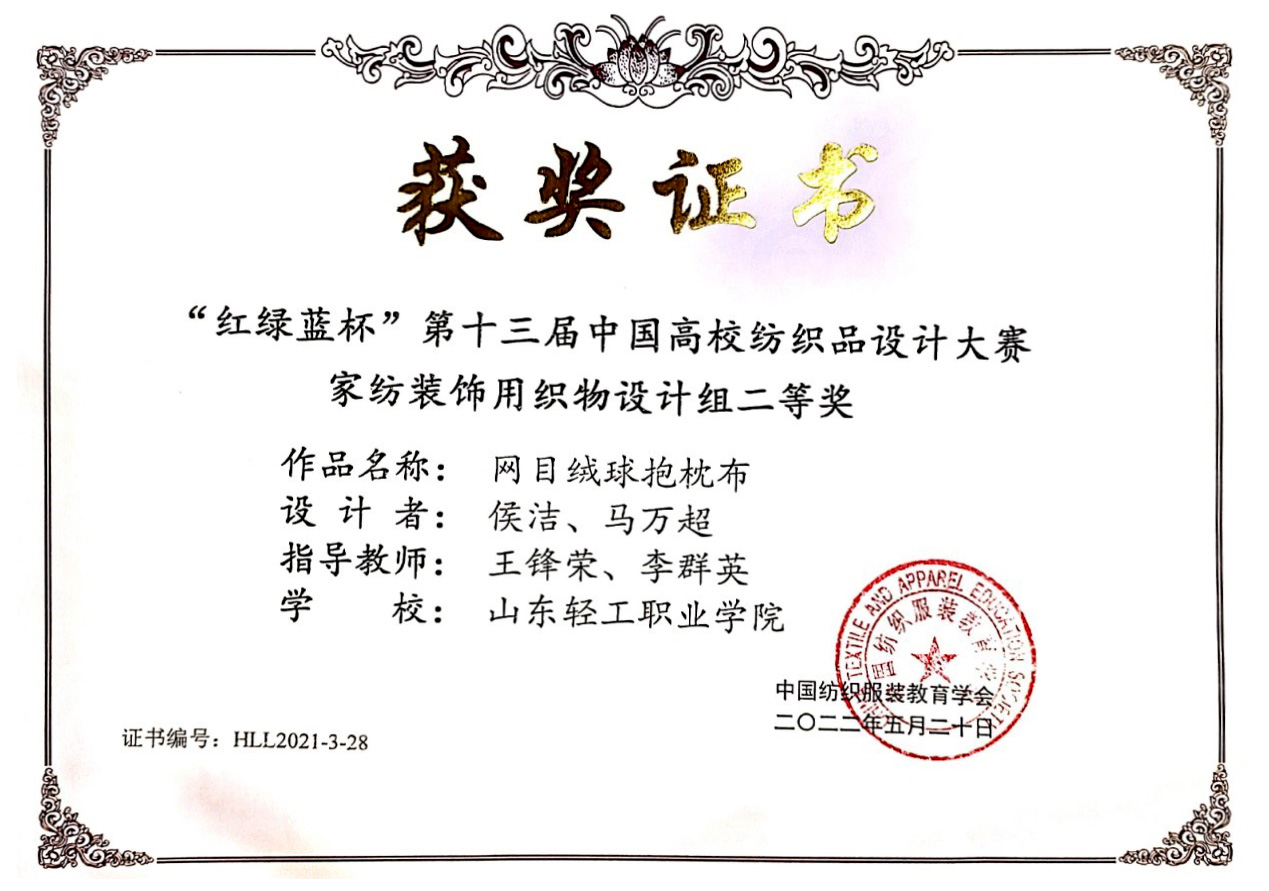 2022年5月24日,由绍兴文理学院组织有关本科院校专家教授进行对比赛作品的评选。在本次评选中,我校纺织工程系王锋荣、丛文新老师指导的学生作品“阻燃立体墙布”获得家纺装饰用织物设计组一等奖;武燕、丛文新老师指导的学生作品“一剪定型”获得家纺装饰用织物设计组一等奖;王锋荣、李群英老师指导的学生作品“网目绒球抱枕布”获得家纺装饰用织物设计组二等奖。我系共参投6件作品,获奖一等奖2项,二等奖1项。