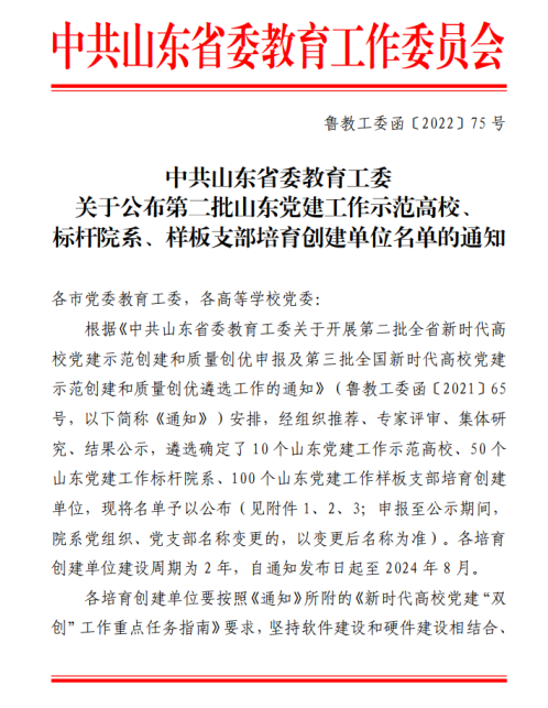 近日,中共山东省委教育工委公布第二批全省新时代高校党建示范创建和质量创优工作遴选结果,我校健康管理系学生党支部入选“山东党建工作样板支部”培育创建单位。