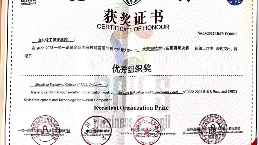 本站讯(通讯员 安敬鑫)2022-2023一带一路暨金砖国家技能发展与技术创新大赛之大数据技术与应用国内赛决赛于近日落下帷幕。我校选派由安敬鑫、王晓老师指导的参赛团队荣获二等奖1项、三等奖1项,学校被一带一路暨金砖国家技能发展国际联盟和金砖国家技能发展与技术创新大赛组委会联合授予“优秀组织奖”。