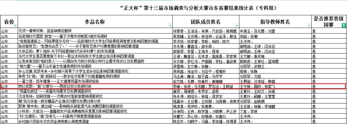 本站讯(通讯员 王守振)近日,“正大杯”第十三届市场调查与分析大赛山东省赛结果出炉,由我校王守振、国帅、杨絮飞三位老师指导,工商管理系21统会核算班李峥、徐进、任志鹏、王晓斌,21会计二班罗志远共五位同学组成调查团队的作品《物以类聚,“脏”以群分——再探垃圾分类新时尚》晋级国赛。
