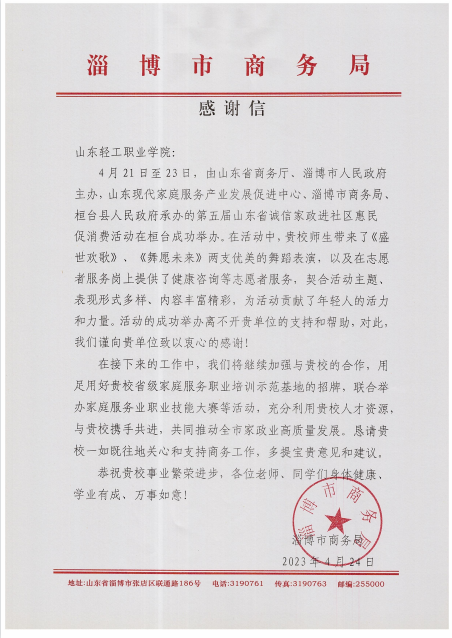 本站讯(通讯员 常渝昕)4月21日-23日,由山东省商务厅、淄博市人民政府主办的第五届山东省诚信家政进社区惠民促消费活动在淄博举办,健康管理系代表学校参加了启动仪式并对婴幼儿托育专业和家庭服务职业培训省级示范基地进行了展示和宣传,同时为活动全程提供志愿服务。