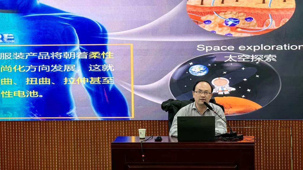 夏教授在简介了天津工业大学基本情况后,结合个人近三年的科研工作,以“智能纺织品关键技术研究”为题,采用问题启发式,从智能可穿戴研究背景及意义、智能可穿戴关键技术——柔性电池研究、智能可穿戴关键技术——温压双参数传感器研究等三个方面,生动形象地展示了其团队在智能纺织品中的研究内容和方法、研究过程及成果。