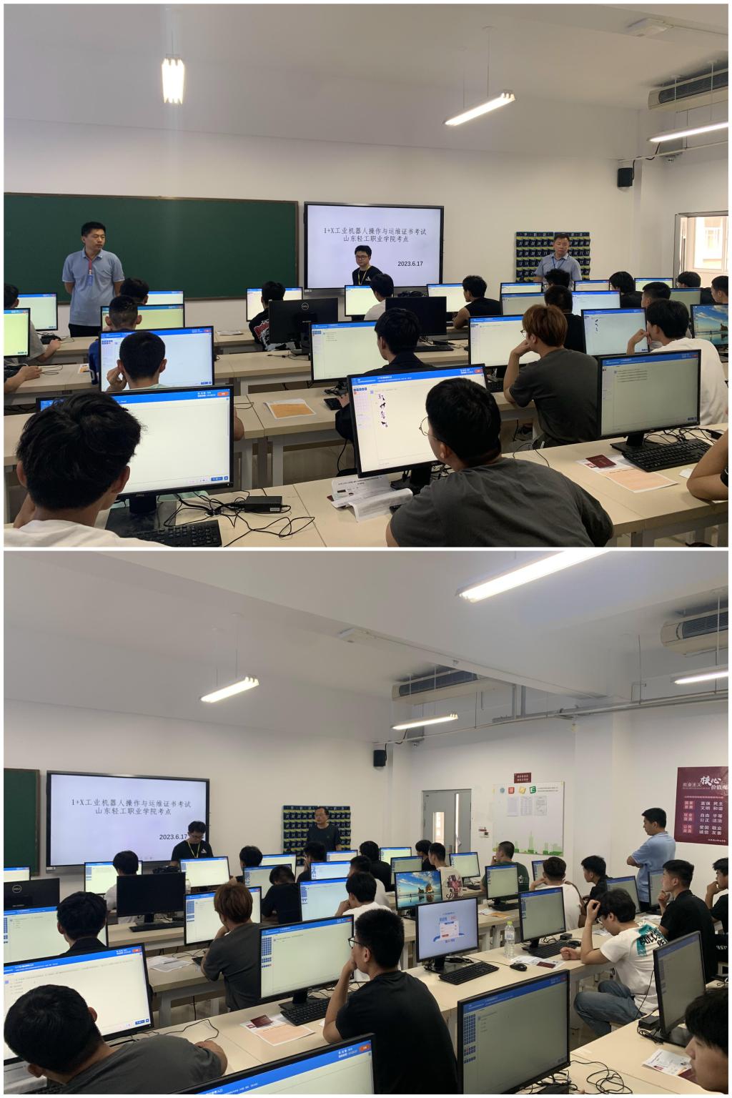 本站讯(通讯员 宋希涛)为深入学习贯彻党的二十大精神和习近平总书记关于职业教育的重要指示精神和全国职业教育大会精神,大力宣传劳模精神、劳动精神、工匠精神,弘扬“劳动光荣、技能宝贵、创造伟大”的时代风尚,机电工程系于6月17日-18日成功举办了“1+X工业机器人操作与运维”职业技能等级证书考试,机电工程系主任薛白莅临指导。本次考试共有64名同学参加,分别于6月17日下午13:30—15:00在T8305和T8306机房完成了理论考试部分,于6月18日8:00—19:00期间,在T8106工业机器人操作与运维实训室分9个场次完成了实操考试部分。