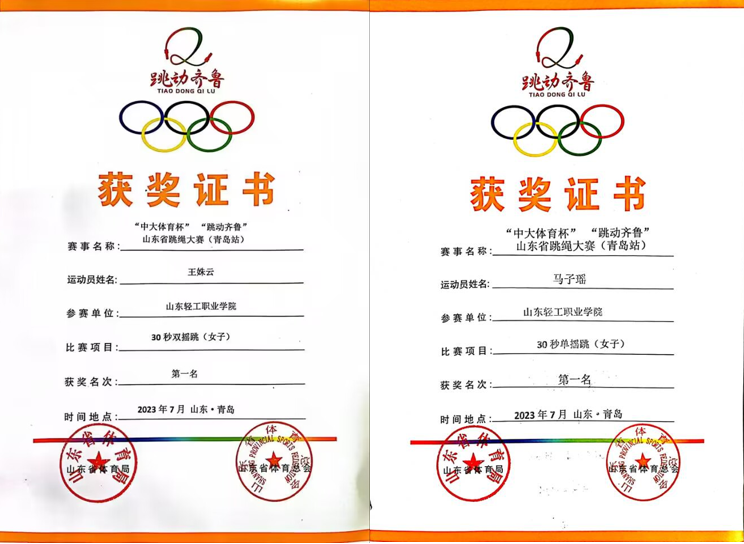 我校跳绳队积极报名参赛,喜获佳绩,共获得六项第一。商务贸易系马子瑶荣获女子组30秒单摇跳第一名、连续三摇跳第一名、三分钟单摇跳第一名;工商管理系王姝云荣获女子组30秒双摇跳第一名、30秒间隔交叉单摇跳第一名、30秒单摇跳第二名;王姝云、马子瑶荣获2×30秒双摇接力第一名。王姝云同学荣获“优秀运动员”荣誉称号、杜杰老师荣获“优秀教练员”荣誉称号。