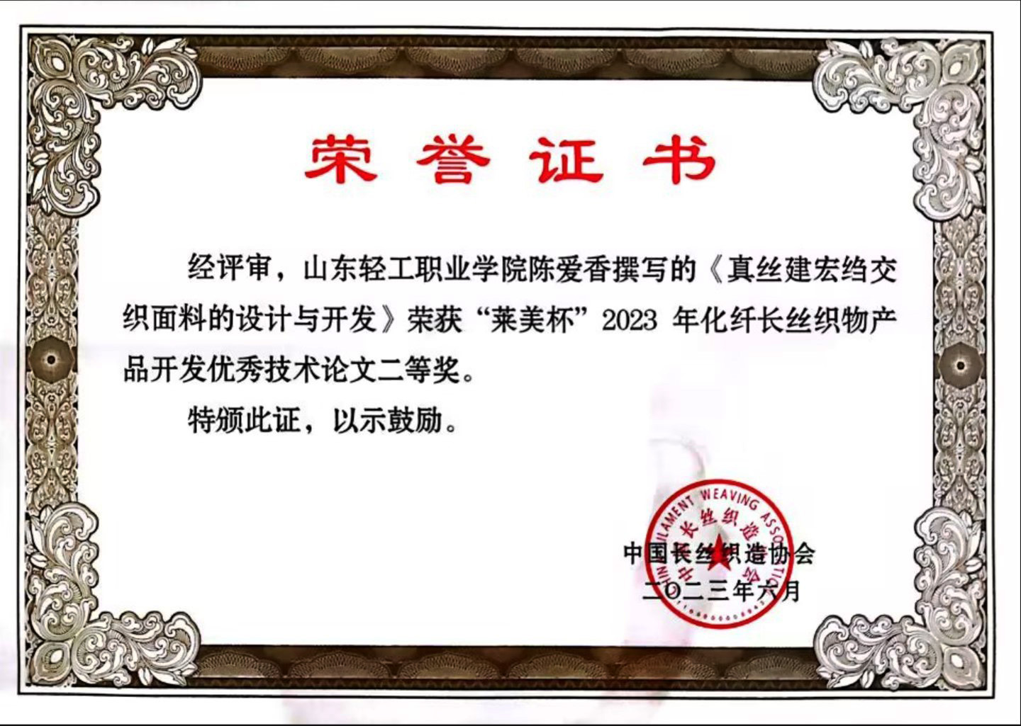 会议最后,颁发了“莱美杯”2023年化纤长丝织物产品开发优秀技术论文奖。本次征集活动共有25篇论文入选。经专家组评审:高校组一等奖2篇,二等奖3篇,三等奖3篇;企业组一等奖3篇,二等奖7篇,三等奖7篇。我校获高校组一等奖1项、二等奖1项。