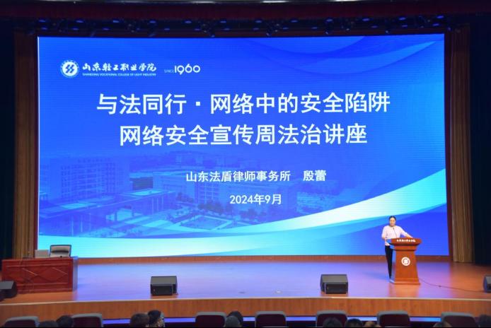 9月13日,学校邀请法律顾问山东法盾律师事务所律师殷蕾开展《与法同行·网络中的安全陷阱》主题讲座。殷蕾从诈骗罪、帮信罪、非法经营罪、侵犯公民个人信息罪等刑法罪名出发,结合实务经验,采用以案释法的方式,为同学们讲述了一堂别开生面的普法课程。