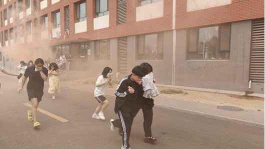 李志刚宣布演练开始,公寓楼警报装置与校园广播同步发出紧急疏散警报。各楼层志愿者引导学生疏散,到达操场集合后,各班迅速清点人数进行上报。