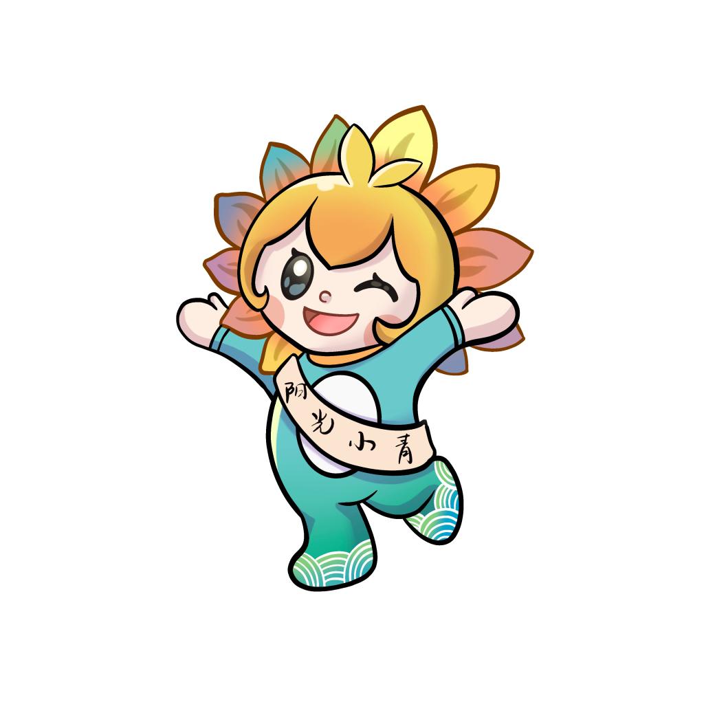小青整体的颜色设计用的是代表青春与活力的青绿色、七彩色、淡蓝色,运用代表活力的七彩色与向日葵相结合,象征着山轻学子们在奔赴的路上,一直充满希望与光明。俏皮的小青,在何时都会一直在学子们的身边排忧解难;脚上的海浪纹代表乘风破浪、直挂沧海的勇气。稚嫩的“小青”就像新一代的“山轻人”,生机勃发、朝气蓬勃。