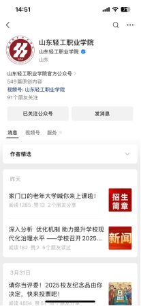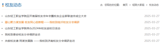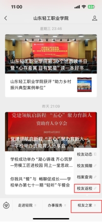 关注学校官方微信公众号(搜索 “山东轻工职业学院”)→ 点击底部菜单栏【校友之家】→跳转至微信端校友板块,手机访问随时随地更方便!