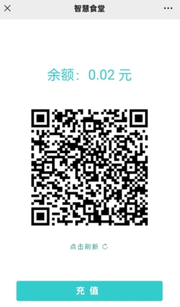 (3)注册成功后进入详情页面,此页面展示当前账户余额与消费二维码,二维码用于在卡机进行消费。如果二维码过期,可点击下方“点击刷新”按钮,刷新二维码。首次进入此页面,账户余额为0,可点击“充值”按钮进行充值。注册成功的用户再次扫描步骤一的二维码会直接进入下方页面。